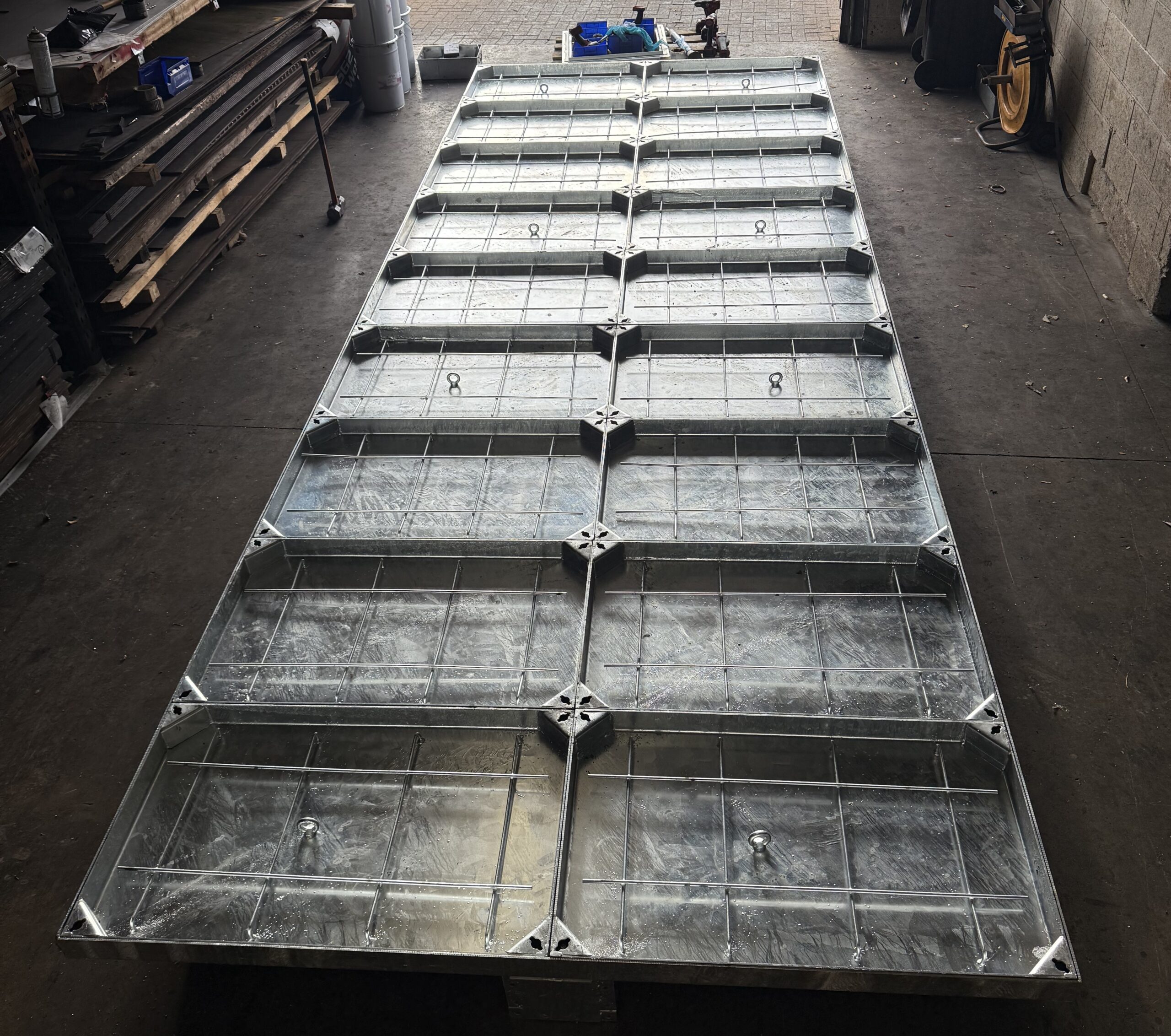 Castings Services Ltd designed and supplied a galvanised steel, recessed, heavy duty, 5.8m x 2m clear opening, 18-part, double sealed and locked access cover and frame.